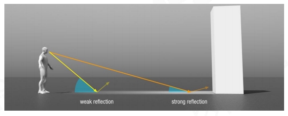 当视线与物体表面的切平面夹角很小时,反射系数会急巨增加,看到倒影效果。