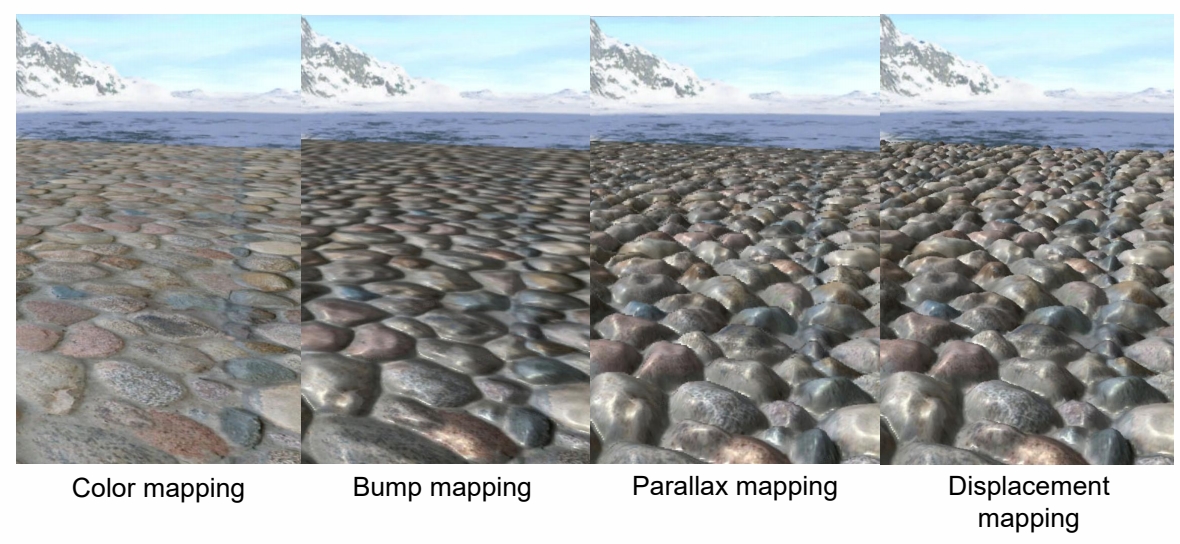 用纹理定义某个点的相对高度,在物体几何信息不变的条件下,得到视觉上的表面凹凸效果,即:用复杂纹理代替复杂几何