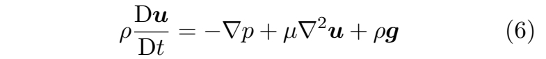 其中 p 表示压力,g 为重力加速度,µ 是描述流体粘性程度的动态粘性系数。公式(6)表明,流体微团的速度变化率受三个力项的影响:压力项(−∇p)、粘性项(µ∇2u) 以及重力项(ρg)。