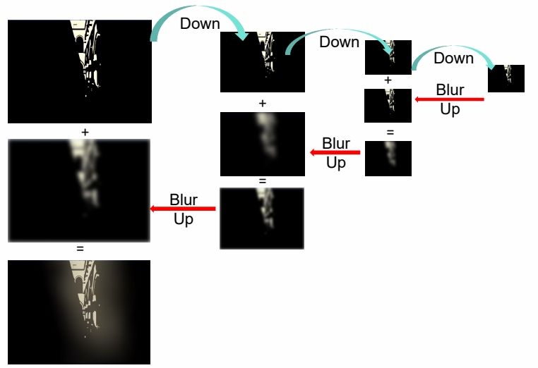 在低精度图上 blur 再放大,可以得到大区域的 blur 效果同时较小的计算量。