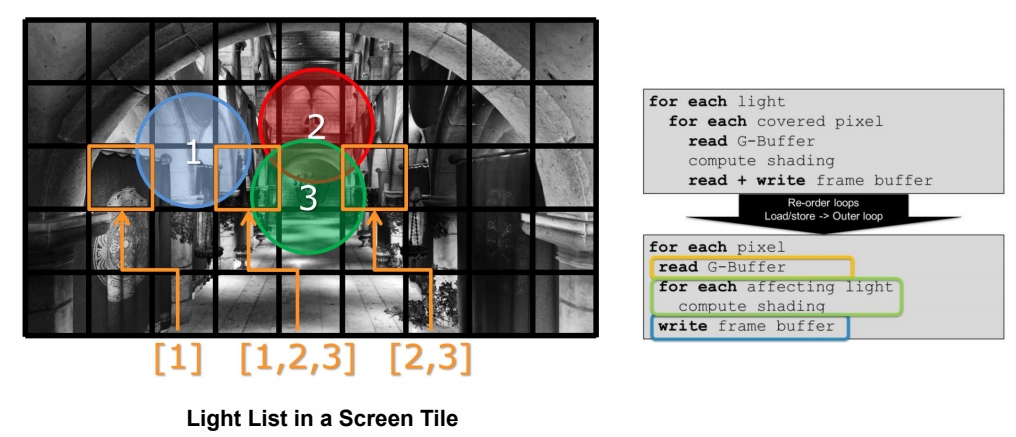 - Tiled light culling (output: light list per tile)