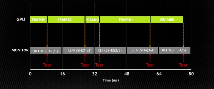 When new GPU frame updates in the middle of last screen frame, screen tearing occurrs