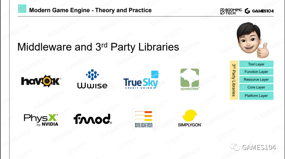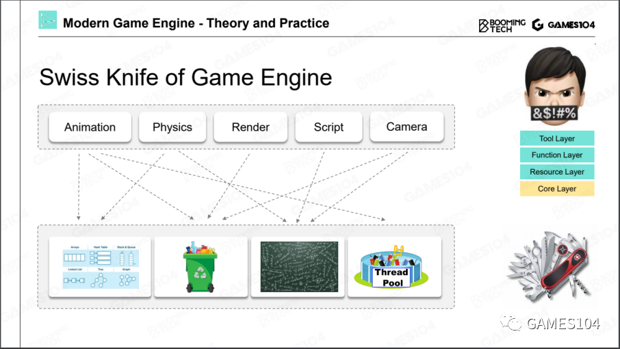 但功能层在很多引擎的架构中,它经常和具体的游戏关联在一起,因此,很多时候哪些功能属于游戏,哪些功能属于引擎,基本上就会在功能层上打架。