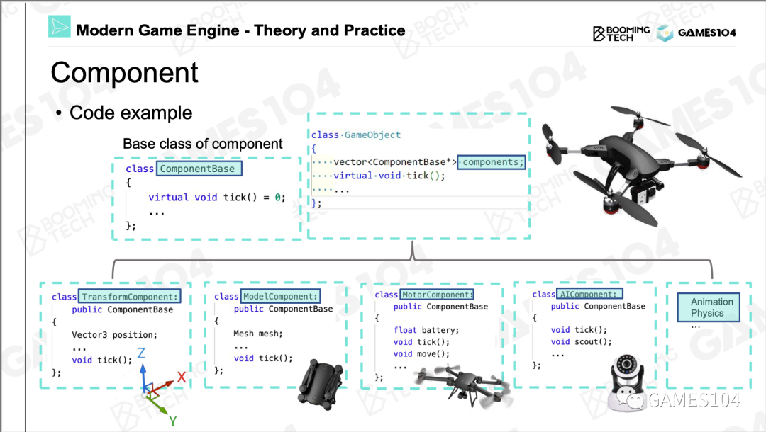 第一,游戏世界里面几乎把所有的东西抽象成了游戏对象Game Object (GO)这样一个东西。第二,每个GO用各种各样多功能的组件把它组合起来,所以各种组件又是游戏对象的原子,如果这两件事情明白了,你就明白了现在游戏的组合的一个基础逻辑。