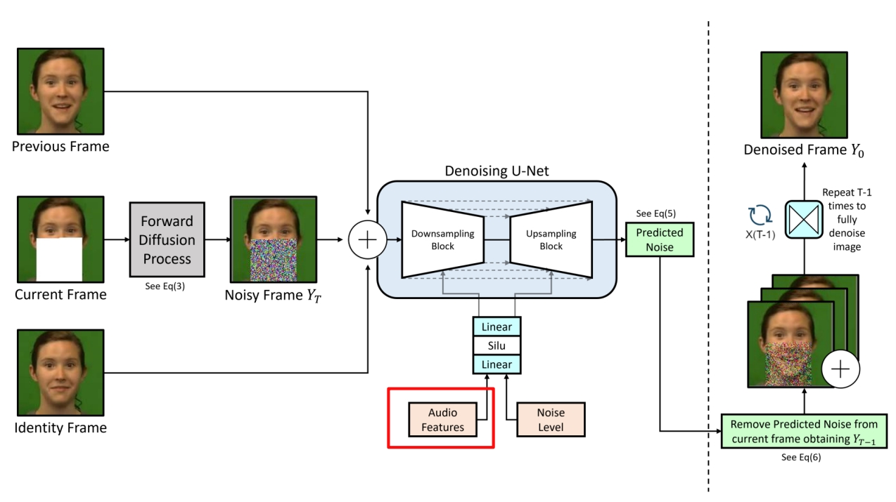 | 2023 | Speech Driven Video Editing via an Audio-Conditioned Diffusion Model | > ✅(1)把说话的部分 mask 掉 (2)用 diffusion 根据 Audio Feature 生成说话的部分。 ✅ 额外约束:(1)reference 状态 (2)前后帧 smooth ✅ 语音驱动嘴形。 | ![]() |