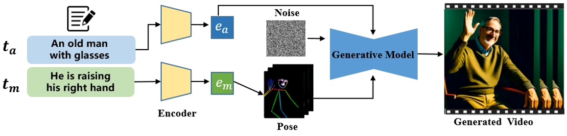 | 53 | Text2Performer | involves the motion text and a motion encoder. motion text describes the movement, such as "She is swinging to the right." The model implicitly models these descriptions by separately representing appearance and motion, thereby generating high-quality videos with consistent appearance and actions. | text作为prompt直接生成video |