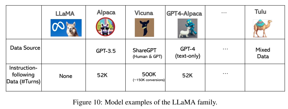 Open-Source LLMs: LLaMA Family. The open-source community has witnessed a surge of open LLM. The success of ChatGPT [32] and GPT-4 [33] offers tremendous opportunities to improve open-source LLMs using instruction-tuning. Figure 10 compares several open-source instruction tuned LLMs. LLaMA [45] is a series of open-sourced LLMs, which match the performance of proprietary LLMs such as GPT-3. To teach LLaMA to follow instructions, Self-Instruct tuning has been quickly adopted given its superior performance and low cost. For example, to name a few early attempts in this line of research, Stanford Alpaca [43] uses 52K instruction-following samples generated by GPT-3.5, while Vicuna [47] uses around 500K high-quality instruction-following samples (150K conversions) between user and GPT [39]. To advance the SoTA of instruction-tuning for LLMs, GPT-4 is utilized as the teacher to generate the responses for the Alpaca instructions [36]. Many papers have been proposed to improve the instruction-following data to improve the model alignment quality in chat. For a comprehensive review, we suggest the readers to refer the recent paper [50], where a LLM Tulu is trained on a mix of several high-quality instruct data, and comprehensive comparisons are conducted across multiple benchmarks.
