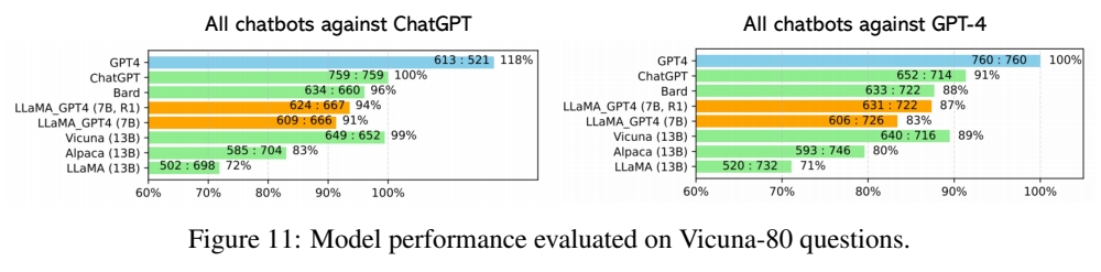 Quick Assessment of LLM Chatbots. To study the quality of LLM Chatbots, We consider Vicuna-Instructions-\(80^2\) [47], a dataset with 80 challenging questions that baseline models find challenging. Beside generic instructions, there are 8 categories, including knowledge, math, Fermi, counterfactual, roleplay, generic, coding, writing, common-sense. To quantitatively compare the performance, we ask GPT-4 to rate the response from score 1 to 10 for any two given chatbots, then compute the relative score. The results are shown in Figure 11. Surprisingly, it turns out this evaluation metric is quite consistent across different settings. The open-source LLaMA family seem performing closely to SoTA proprietary Chatbots.