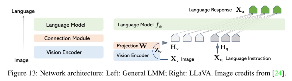 As illustrated in Figure 13, the LLaVA network architecture is an instantiation of the general image-to-text generative model framework introduced in Section 2 and Figure 3. Specifically, LLaVa connects pre-trained CLIP ViT-L/14 visual encoder [37] and large language model Vicuna [47], using a simple projection matrix. A two-stage instruction-tuning procedure is considered: