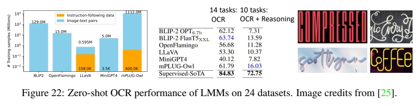 It is surprising that LMMs shows strong zero-shot OCR performance in the wild, without explicitly training on text recognition data. To shed light on the hidden mystery of OCR in LMMs, a compre-hensive empirical study is conducted in [25] to compare open-source LMMs on 24 academic text recognition datasets, shown in Figure 22. Three observations are highlighted: (1) LLaVA consistently outperforms miniGPT-4 on 21 out of 24 datasets, despite LLaVA being trained with an order of magnitude smaller training data. (2) Training with significantly larger training data leads to higher OCR performance, as demonstrated by BLIP2 [20] and mPLUG-Owl. (3) In most cases, supervised SoTA results significantly outperform zero-shot LMM. However, it is worth noting that in the WordArt dataset [55], which primarily features challenging artistic text, BLIP2 surpasses supervised SoTA. This reveals the potential of LMM in recognizing more complex text types.