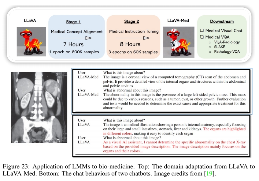 LMMs have been recently explored in the biomedical domain [42, 63, 19], where conversational gener-ative AI has demonstrated remarkable promise for empowering biomedical practitioners. LLaVA-Med is a cost-efficient approach for training a vision-language conversational assistant that can answer open-ended research questions of biomedical images. The key idea is to leverage a large-scale, broad-coverage biomedical figure-caption dataset extracted from PubMed Central, use GPT-4 to self-instruct open-ended instruction-following data from the captions, and then fine-tune a large general-domain vision-language model LLaVA using a novel curriculum learning method. Specifically, the model first learns to align biomedical vocabulary using the figure-caption pairs as is, then learns to master open-ended conversational semantics using GPT-4 generated instruction-following data, broadly mimicking how a layperson gradually acquires biomedical knowledge. In Figure 23, we provide examples on the biomed visual conversations of different chatbots. LLaVA-Med precisely answers the questions with biomedical knowledge, while LLaVA behaves like a layperson, who hallucinate based on commonsense.