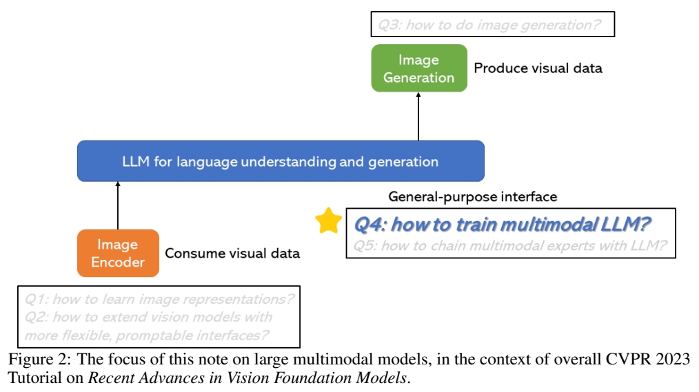 In the full tutorial, as shown in Figure 2, we have covered the most recent approaches and principles at the frontier of learning and applying vision foundation models, including Q1: Visual and Vision-Language Pre-training; Q2: Generic Vision Interface; Q3: Alignments in Text-to-image Generation; Q4: Large Multimodal Models; and Q5: Multimodal Agents.
