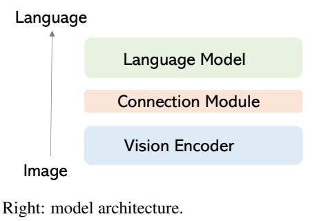 - Model Architecture. As illustrated in Figure 3 (a) Right, the model typically consists of an image encoder to extract visual features, and a language model to decode the text sequence. The vision and language modalities can be optionally connected by trainable connection module. The image encoder and language model can be either trained from scratch or initialized from pre-trained models.