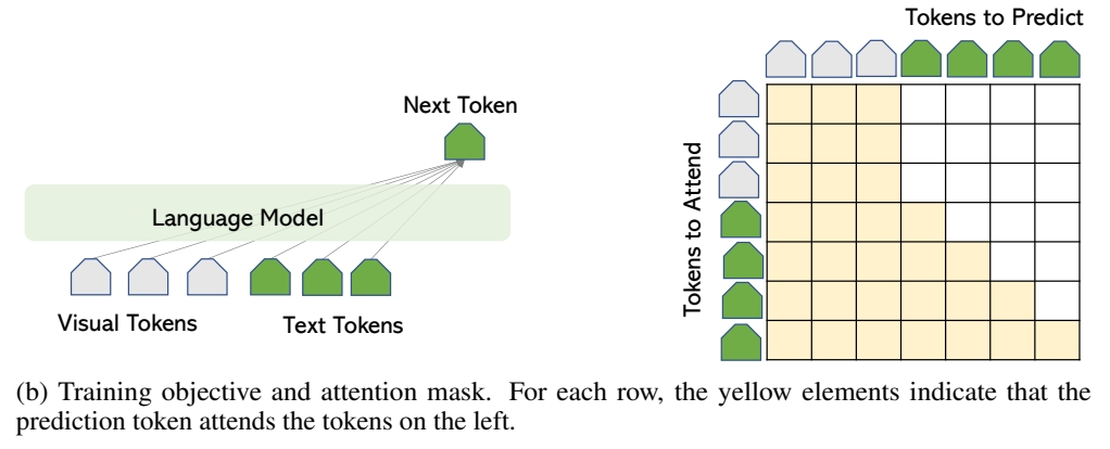 - Training Objective. As illustrated in Figure 3 (b), it typically employs an auto-regressive loss on the output text tokens. For the attention map in the Transformers [46], image tokens can attend to each other, and the text token depends on and all image tokens and the previous text tokens.