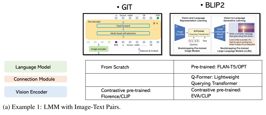 Case Study I: LMM trained with image-text pairwise instances. Most LMMs are trained on a large number of image-text pairs, where each training sample is a pair. GIT and BLIP2 are two large models that achieve state-of-the-art (SoTA) performance on many datasets. The comparisons are shown in Figure 4(a). GIT [48] initializes image encoder with constrastive pre-trained Microsoft Florence model, and train a language model from scratch. On the other hand, BLIP2 freezes the weights of pre-trained image and language model, and a train lightweight Q-former. BLIP2 [20] shows higher sample-efficiency with the bootstrapping training method.