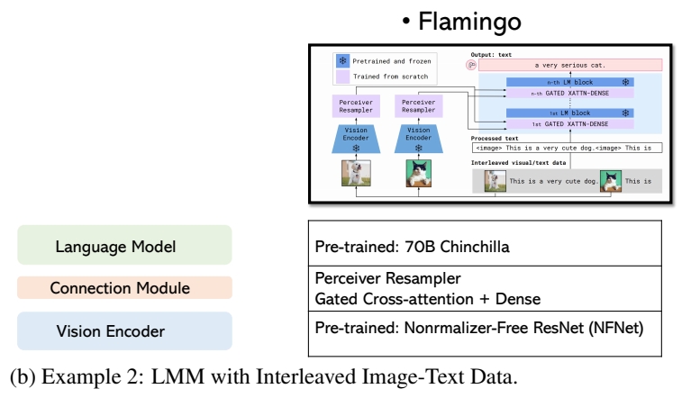 Case Study II: LMM trained with interleaved image-text sequence instances. We use Flamingo [1] as example, shown in Figure 4(b). It connect the frozen pre-trained image and language models – by adding novel architectural components in between. Specifically, Perceiver Sampler module helps reduce compute complexity, and Gated Transformer module helps stabilize training in the initial stage. Flamingo is trained on a mixture of complementary large-scale multimodal data coming only from the web, without using any data annotated for machine learning purposes. After this training is done, Flamingo can be directly adapted to vision tasks via simple few-shot learning without any additional task-specific tuning.