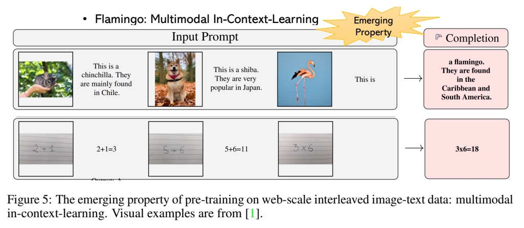 Multimodal In-Context-Learning. Beside the SoTA performance on dozens of academic bench-marks, proabably the most appealing aspect of Flamingo is that it exhibits an emerged property: Multimodal In-Context-Learning. Specifically, given a couple of image-text pairs as examples, Flamingo can zero-shot task transfer to new unseen problems, such as solving visual math problems. This means Flamingo can tackle a number of difficult problems with just a handful of task-specific examples, without any additional training required. For example in Figure 5, two new tasks are presented to Flamingo. The top row provides two image-text pairs as the context in the prompt, where the text describes the name of the animal in the image, followed by the geographical information of the animal. Flamingo is able to understand the patterns in the task instruction illustrated by the examples, and output the corresponding information for a new image. In the bottom row, the text first shows the optical character recognition (OCR) result of the image, followed by the arithmetic result. Flamingo learns the task instruction illustrated in the multimodal context, outputs the correct answer for a new math problem in the image. Therefore, Flamingo is generally considered as the GPT-3 moment [3] in the multimodal domain.