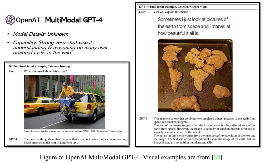 In March 2023, OpenAI released GPT-4 [33], with impressive capability in visual understanding and reasoning. Though the model details are unknown, there is no doubt that GPT4 enables many new scenarios, based on the examples highlighted the technique report. For instance, two popular visual examples are illustrated in Figure 6. The first one identifies the uncommon visual region and exhibits strong complex reasoning performance. The second one recognizes text in the image and captures the mere across image-text. For a while, the research community had no clue how this new ability is achieved (probably because they are not tightened to any established academic tasks/datasets), but all are determined that these are exciting results. It naturally raise a question: How can we build Multimodal GPT-4 like models?