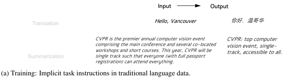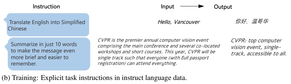 Traditional Language Data. As a typical data instance in NLP, seq2seq representation is quite common for many language tasks: each data instance consists of two parts: sequence as the input and sequence as the output. We provide two examples in Figure 8 (a). Without any task instruction specified, we know they are translation and summarization tasks, respectively.