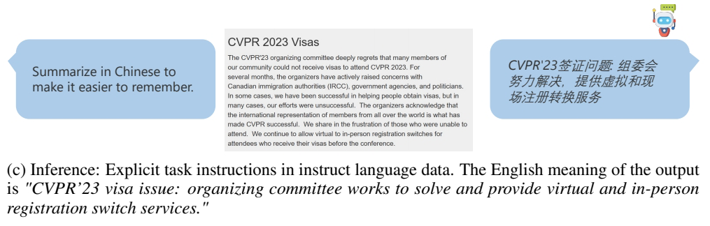 For example, in the evaluation stage, a new task that require both summarization and translation is provided in Figure 8 (c). Though the model has never seen this new task in training, it observes individual task basis, and learn to perform on new tasks. Note that we humans are always creating new tasks in our daily life, and presumably these new tasks would never been observed by models. It is thus appealing if a model is able to solve thousands of new tasks in the wild in without training. This is partially why ChatGPT is becoming popular and prevalent quickly.