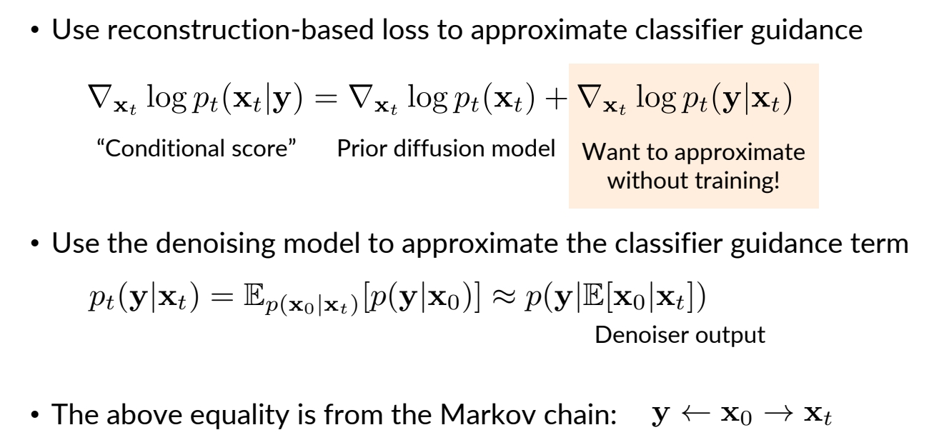 ✅ cfg 使用\((x,t)\)的 pair data 来近似 \(\nabla _{x_t} \log p_t(\mathbf{y}|\mathbf{x}_t)\),但此处没有 pair data,希望通过非训练的方法来得出。