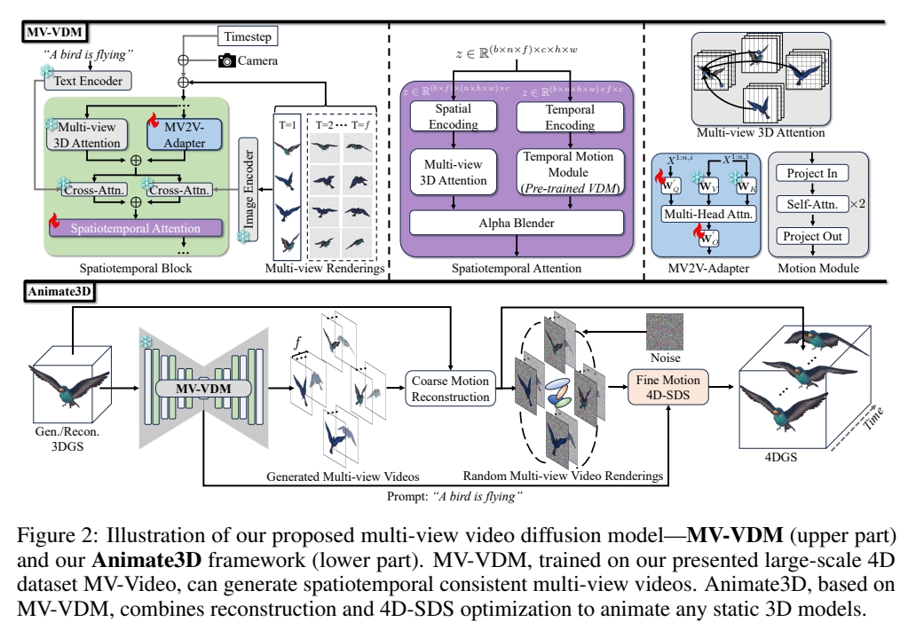 3)基于MV-VDM,我们引入结合重建技术与4D分数蒸馏采样(4D-SDS)的框架,利用多视图视频扩散先验实现3D对象动画。